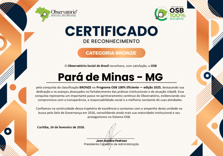 O Observatório Social do Brasil de Pará de Minas recebeu o certificado de OSB 100% eficiente, um reconhecimento do cumprimento...